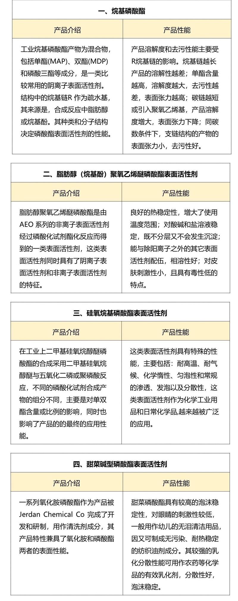 其它種類磷酸酯其他類型的磷酸主要包括:烷基醇酰胺磷酸酯、咪唑啉類、羥基類磷酸酯和高分子磷酸酯。